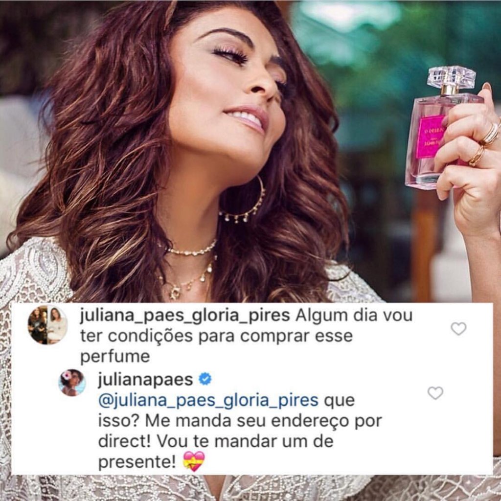 A atriz Juliana Paes deu um presente para uma fã. De acordo com o site Observatório dos Famosos, Juliana teria dado um item da sua linha de perfumes para uma seguidora, que faz parte de um dos seus fã-clubes, depois que ela desabafou, por meio do Instagram, que não tinha dinheiro para comprar o produto. “Algum dia vou ter condições para comprar esse perfume”, escreveu o perfil. Como resposta, a atriz disse que daria o perfume: “Que isso? Me manda seu endereço por direct! Vou te mandar um de presente!”.